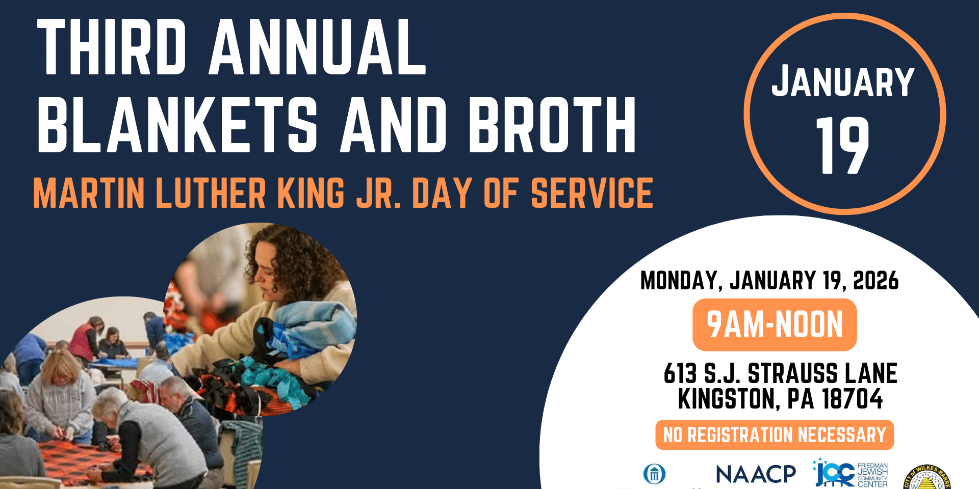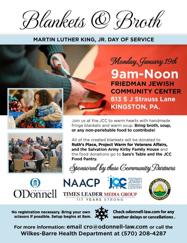 O’Donnell Law Firm, Friedman Jewish Community Center, and Luzerne County NAACP in cooperation with the Wilkes-Barre Health Department will be conducting the third annual “Blankets and Broth” program which will take place at the Friedman JCC in Kingston (S.J. Strauss Lane) on Monday, January 19, 2026, with arrival beginning at 8:00 AM and the event starting at 9:00 AM. Held on Martin Luther King Jr. Day, this third annual service event brings volunteers together to make no-sew fringe blankets and collect non-perishable food for neighbors in need.