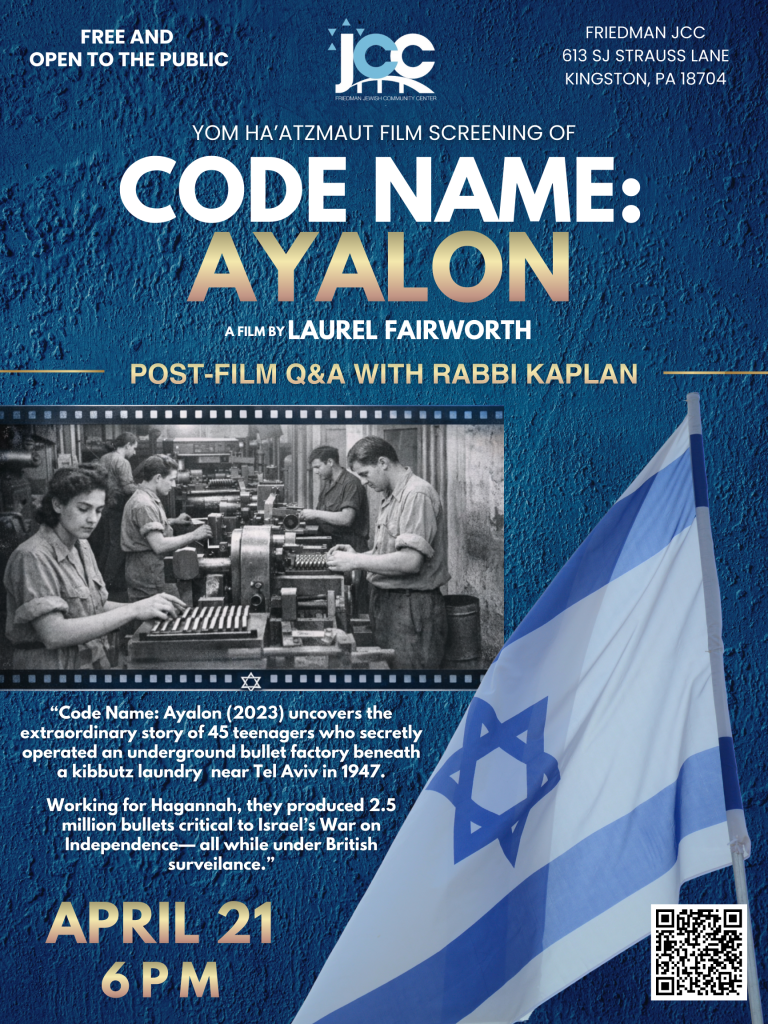 Join us for a powerful evening as we screen Code Name: Ayalon, an extraordinary documentary that tells the true story of 45 teenagers who lived and worked in complete secrecy, operating an underground bullet factory hidden beneath a kibbutz laundry in the years leading up to Israel’s War of Independence. By day, life above ground appeared ordinary. Below the surface, these young men and women labored tirelessly in dangerous, suffocating conditions to manufacture the ammunition desperately needed by freedom fighters on the front lines.